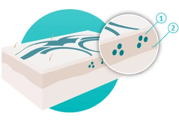Beim Permanent Make-Up werden durch das Durchstechen der Haut Farbpigmente (1) in die mittlere Hautschicht (2) eingebracht (Bild A).